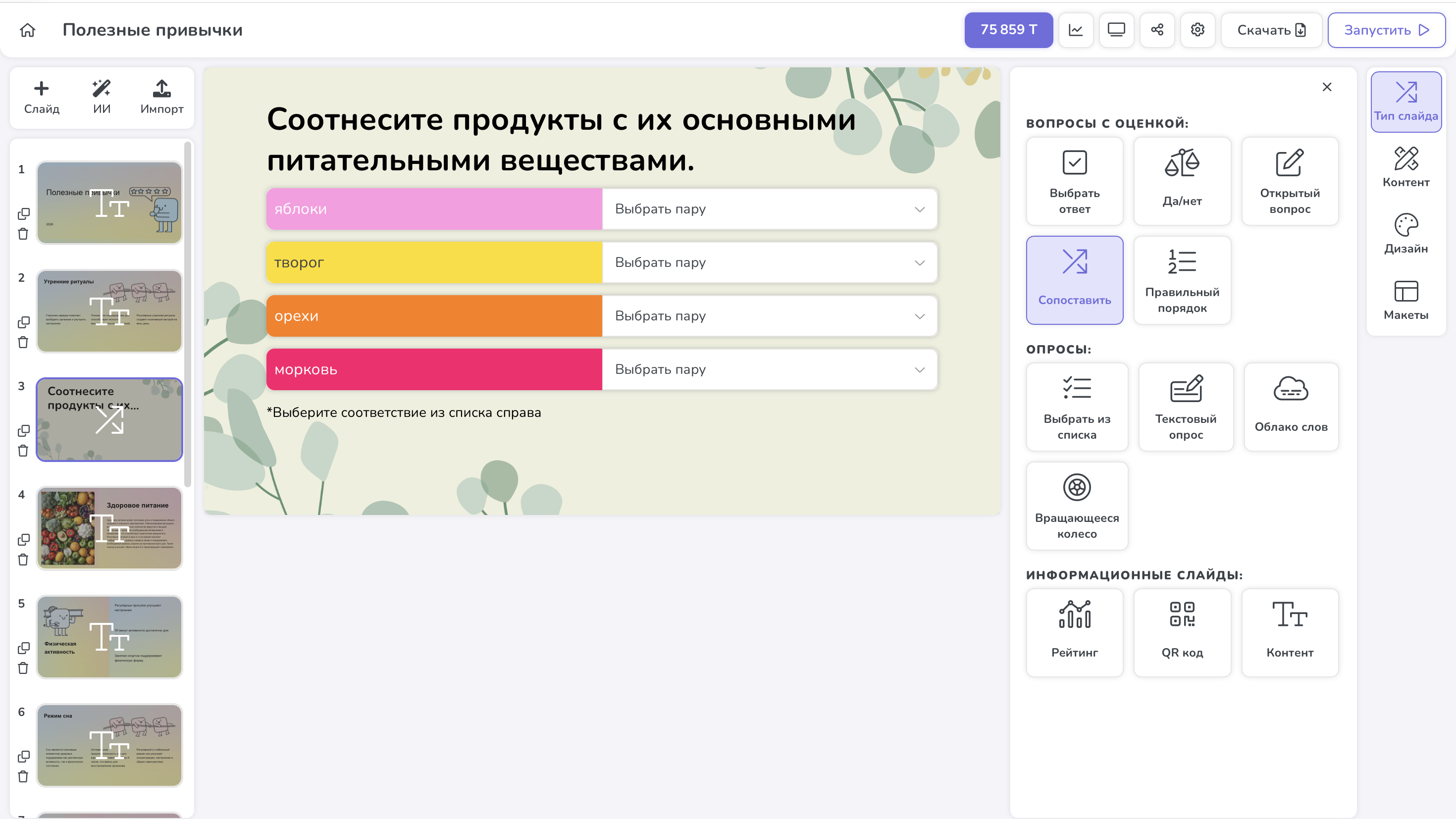 Платформа оснащена множеством полезных функций для вовлечения аудитории. Это позволяет сделать выступление более динамичным и вовлечь аудиторию в процесс. Среди них: различные типы вопросов и опросов, добавление настроек вопроса в виде количества баллов за ответ, время на вопрос и др. Эти функции представлены на панели справа в разделе “Контент”.